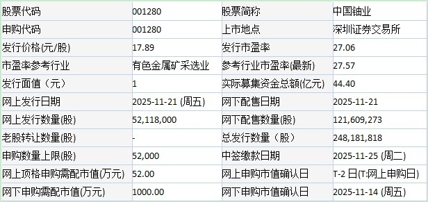 中国铀业2025年11月20日发布的首次公开发行股票并在主板上市发行公告显示配资网首页,公司本次募投项目预计使用募集资金为411,000.00万元。按本次发行价格17.89元/股计算,预计公司募集资金总额为443,997.27万元,扣除预计发行费用约7,734.73万元(不含增值税)后,预计募集资金净额为436,262.54万元。