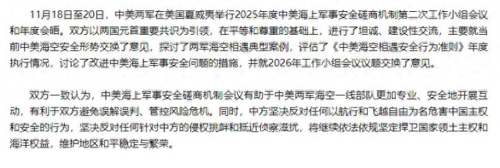 中美会议有助于两军一线部队更加专业、安全地开展互动,有利于双方避免误解误判、管控风险危机。