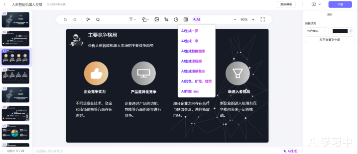 生成初稿后,真正的协助才刚刚开始。7牛AI PPT内置的 “全链路AI编辑工具箱” ,让你在后续的每一处修改都能获得智能支援: