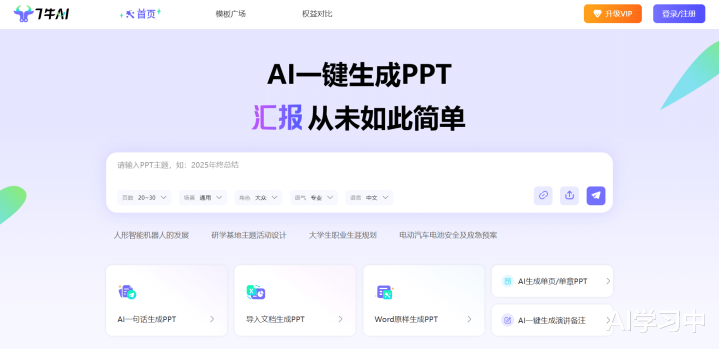 在体验了多款国内外主流工具后,我发现一款名为 7牛AI PPT 的国产工具,它或许不是最“炫技”的,但在解决中国职场人实际痛点的综合体验上,却像一位沉稳可靠的“全能型助手” ,提供了从启动、创作到交付的完整流畅体验。